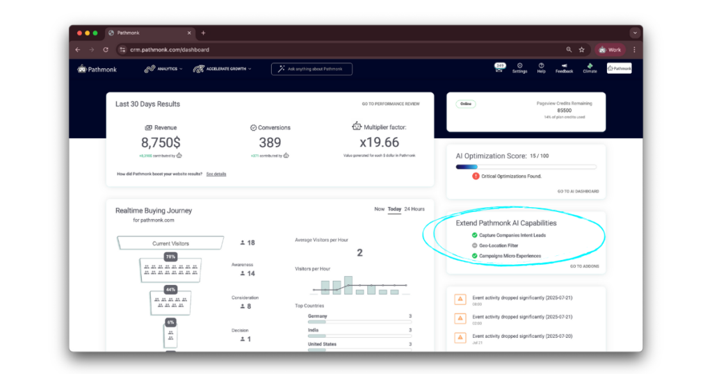 Whether you’re running campaigns, testing new messaging, or just trying to better understand your traffic, Pathmonk gives you the data you need to act. And if you’re ready to scale, you can easily connect your CRM, trigger workflows, and feed your sales pipeline with warm leads.