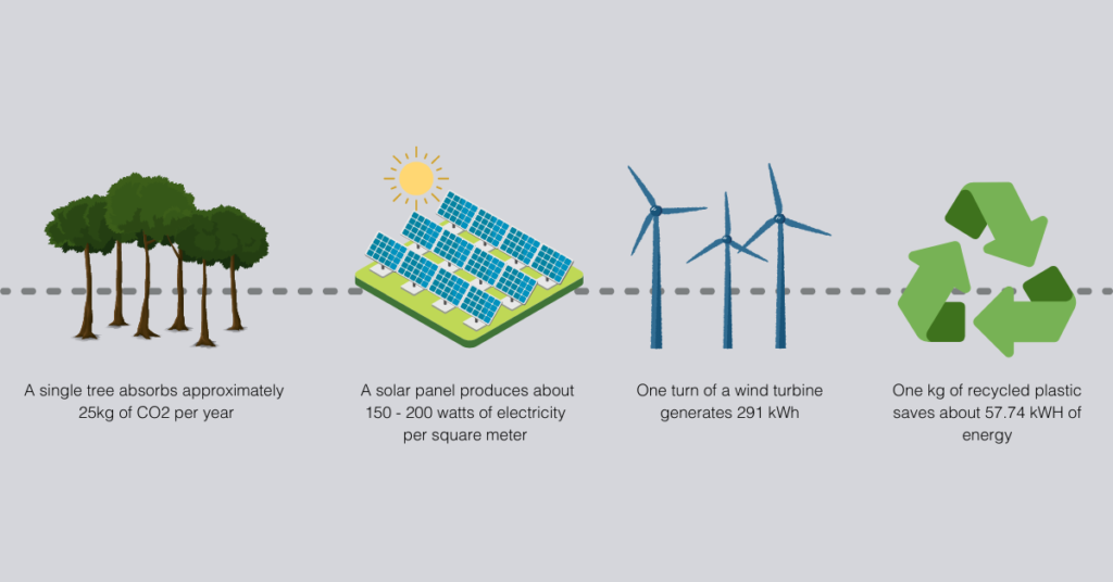 With one full rotation of a wind turbine, you can generate 291 kWh, this means we will require 5 turns to compensate for our emissions. Recycling one kg of plastic saves about 57.74 kWh of energy, we will need to recycle 25kg to create carbon neutrality.
